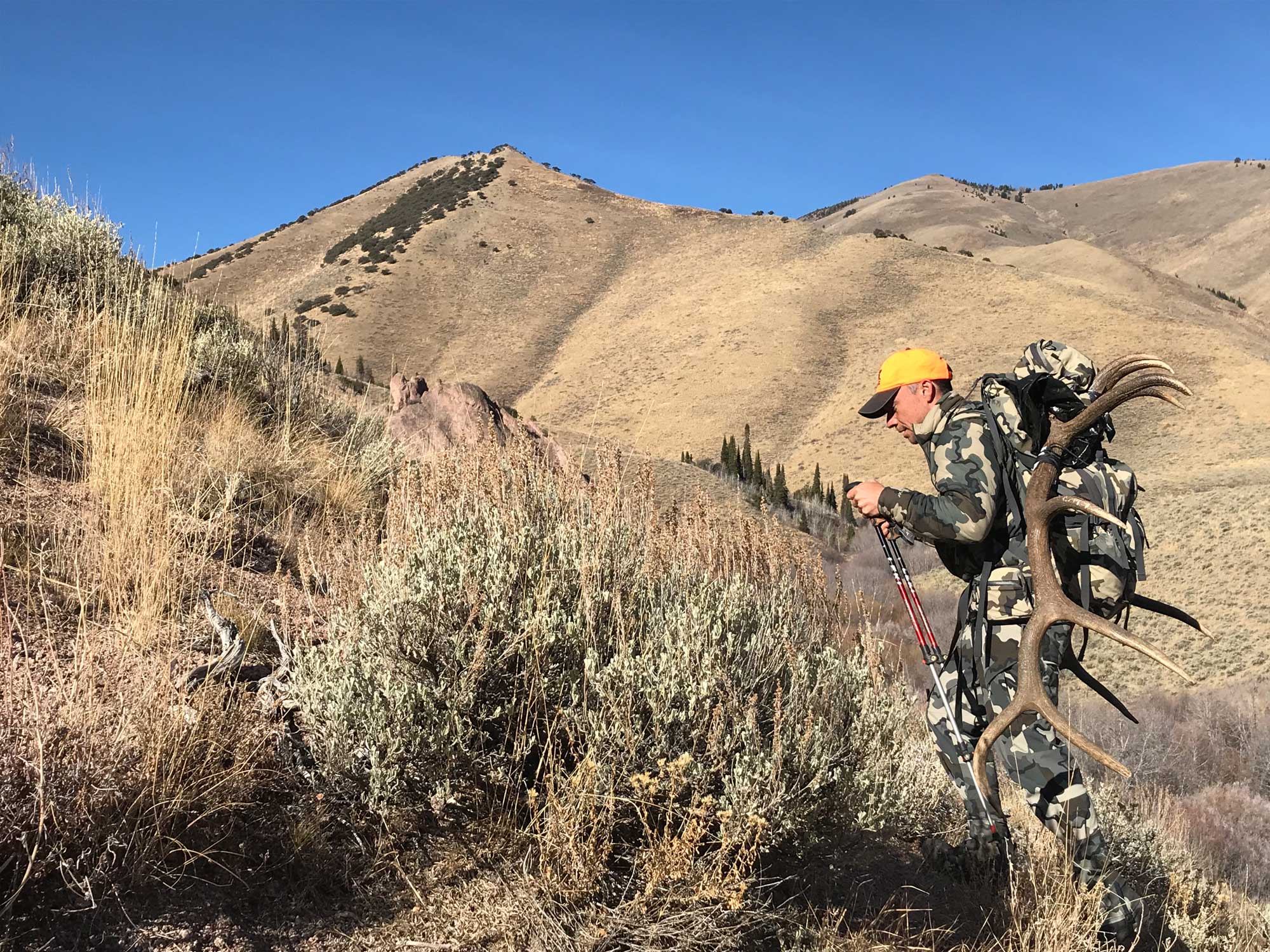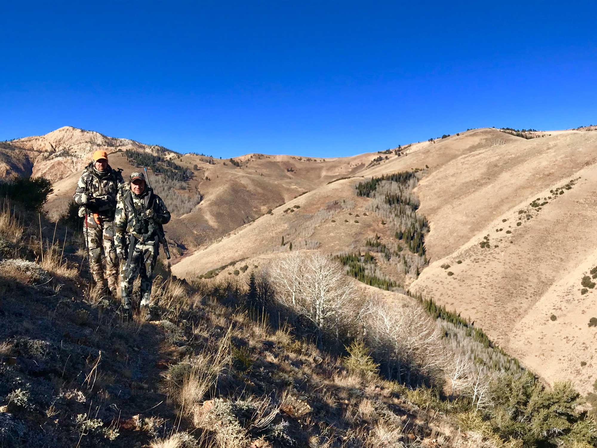 Now we had a serious predicament on our hands. It was 8:00am and this bull was feeding uphill toward a saddle at the top of the mountain range. We could drop the 1500 feet to the river below and come up the spine he was on, but the thermals would certainly give us away. It looked like the only option was to head to the top of the range, circle a basin, and run the ridgeline to get above him. Somehow it didn’t seem possible to climb another 1,000 feet or so and cover 3 ½ miles before this bull made it to the shady side of the mountain. But what did we have to lose? We covered that ground as fast as we could, but in the back of our minds we knew we were fighting a losing battle. As we arrived at the saddle that we thought the bull would go through, neither the bull nor the herd of cows was anywhere to be found. I radioed Nancy to let her know we were too late and I would call her with our plan in a little while. She let us know she watched the elk feed over the top 20 minutes before we arrived…So close.