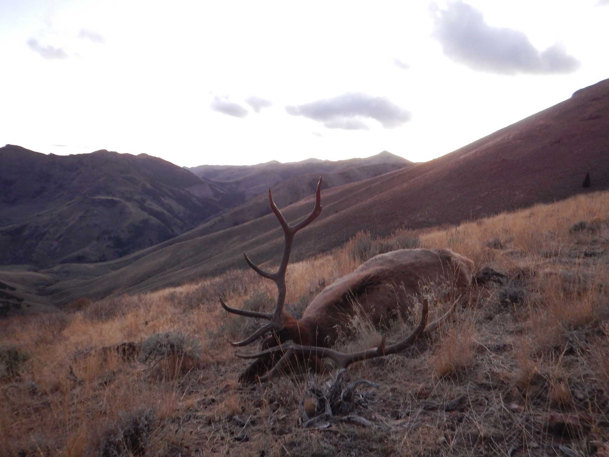 My choices now involved waiting until tomorrow (the last morning of my hunt) and hoping to find this bull again or pushing my luck and seeing if I could make something happen. I was now down to 75 minutes of legal shooting light and the herd of cows didn’t look like they were going anywhere. Being that I was now pinned down on a rock covered peak with nothing but loose rocks for 100 yards, my moves were going to be low percentage odds at best. I decided I would bump the cows and pray they didn’t run around the knob the bull was behind and take him with them. With the cows finally starting to mill around, I put my backpack on and started to slowly stand. Just as I did, the bull worked around the knob and into a grassy saddle. I slowly sank back down and radioed for a time update. Nancy replied “You have 60 minutes.” As if on cue the cows got up and started feeding toward the bull. I waited as long as I could for most of the herd to make it into the mahogany’s 300 yards away. With half the herd still in view I slowly stood and started picking my way down the open rock face. I never looked up for fear of what I would see. This would most likely be my last minute bull running away. With my head down I finally arrived at the saddle that the cows had been on minutes before. I slowly looked their way and by some miracle there they stood feeding in plain sight without a care in the world. “You’ve got 48 minutes.” The update snapped me back to reality. My next step would seal my fate. After being so cautious on the open face, I made the trees and started to relax. With one slip and the sound of gravel underfoot, the whole herd stood at attention. A cow barked and I expected the herd to explode in all directions. Knowing the stalk was over, I decided to range the bull and see how close I had gotten. To my surprise the bull was within my range and in a blur my backpack was off and my turrets adjusted. I lay prone and waited for the bull to turn broadside. As the rifle’s thunder echoed down the valley, the bull laid his head down on that mountain for the final time.