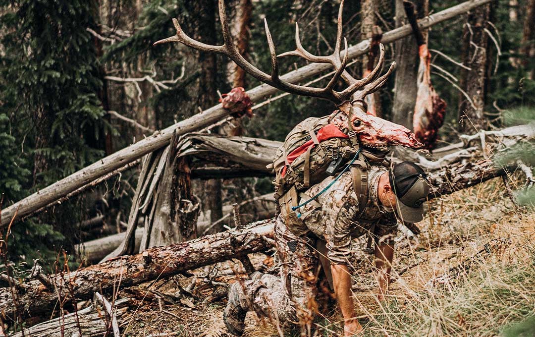 It’s 3:30pm as we point downhill, glancing back at the meat hanging in the trees, knowing that we have a second round-trip to make. Jim Carrey’s movie line “I’m kicking my own ass, do you mind?!” plays in my mind knowing what’s to come.