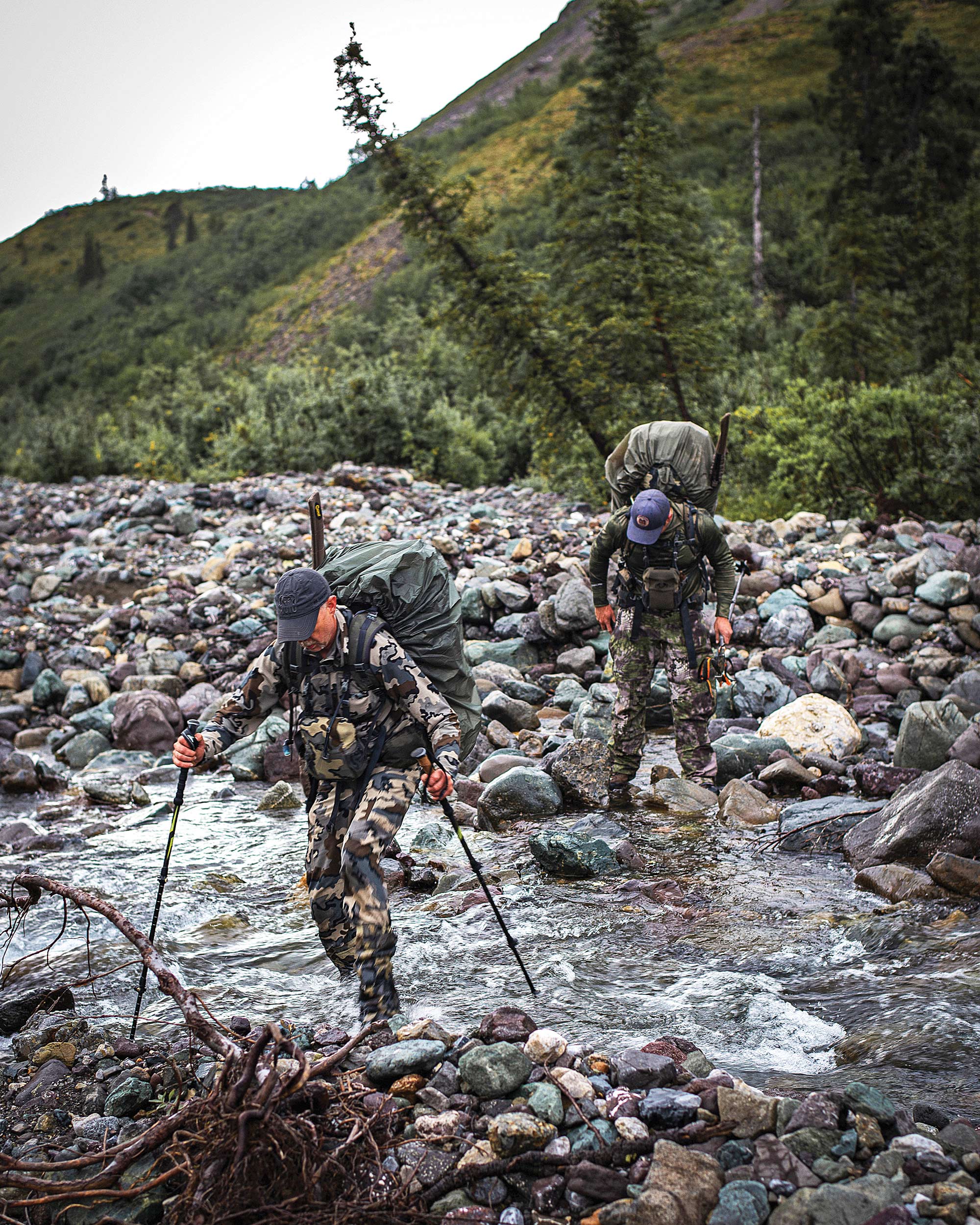 The next day the sheep meat showed signs of turning, so we decided to load it up and head over the pass to Austin's four-wheeler. Of course, the rain came back to greet us for the hike out. The pass was steep and no real trail defined it. Up the shale and loose rock we climbed until we summited the pass and could see below us the river valley that we had ascended eight days earlier. As we descended lower into the river bottom, the alders thickened and had us searching for a moose trail. We ended up crossing the creek multiple times, trying not to fall on the slick boulders that made up the creek bed.