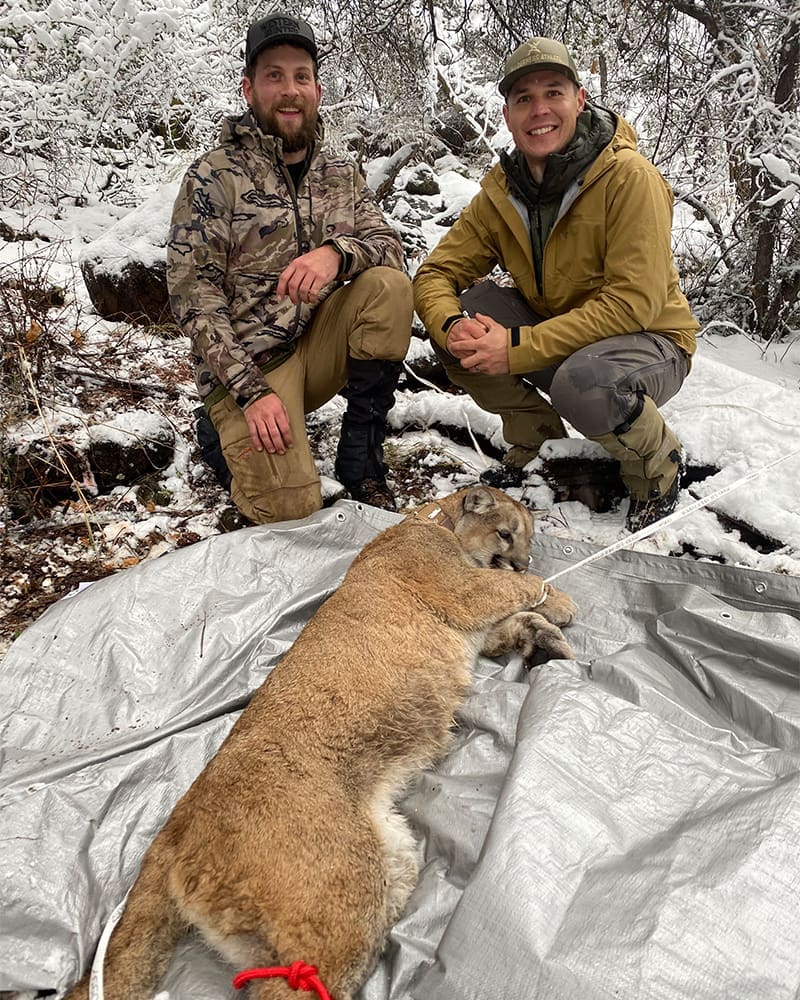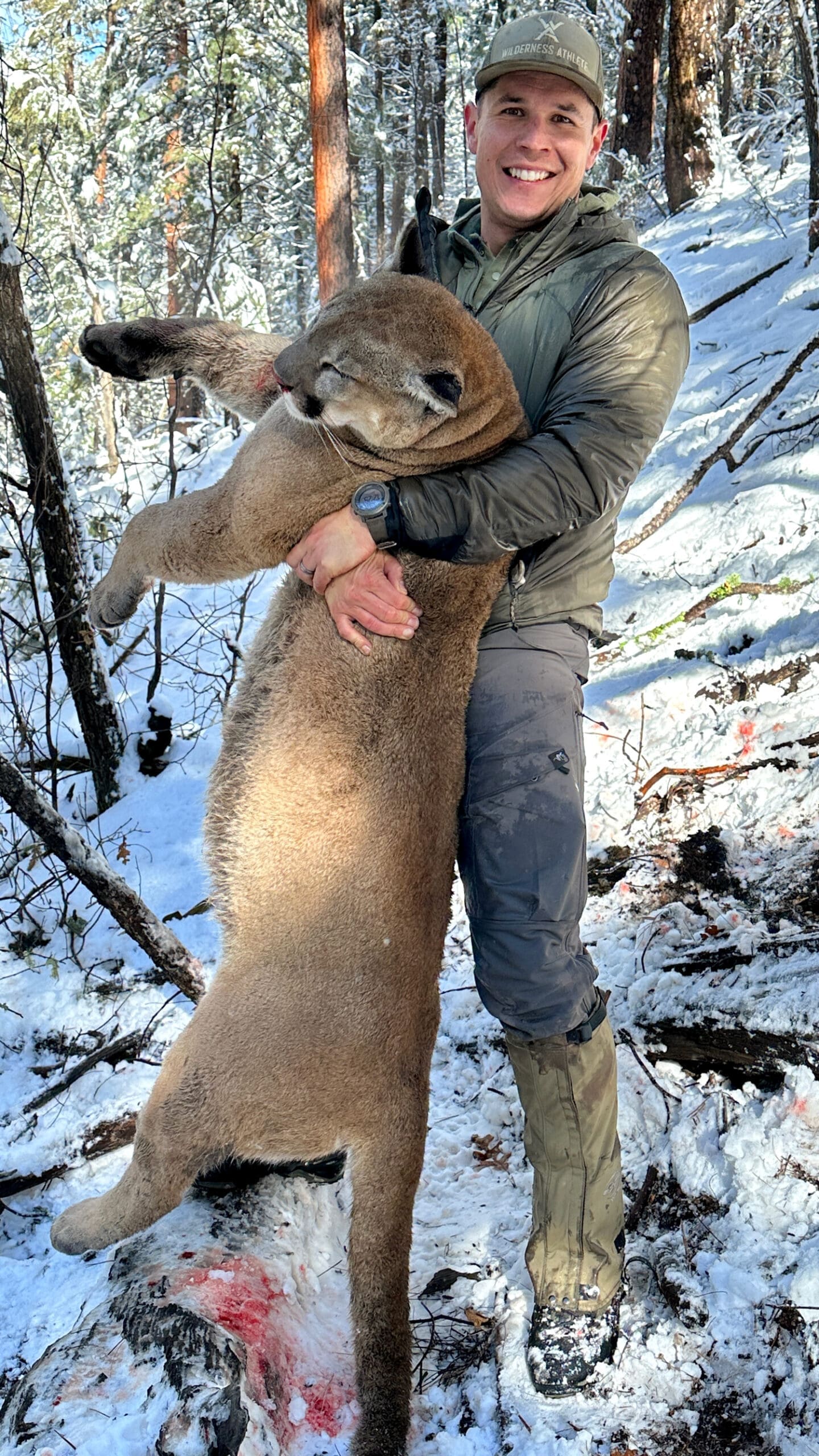 I kept trudging through the snow between the pines for another 20 minutes or so. When I came to a big canyon where my ears were full of baying, I crested the edge and was staring right into the soul of a 180-lb lion about 40 yards away. His gaze was locked on me, and it gave me a big chill and a healthy dose of primal terror. These things mean business. They are designed to kill, eat, and repeat.