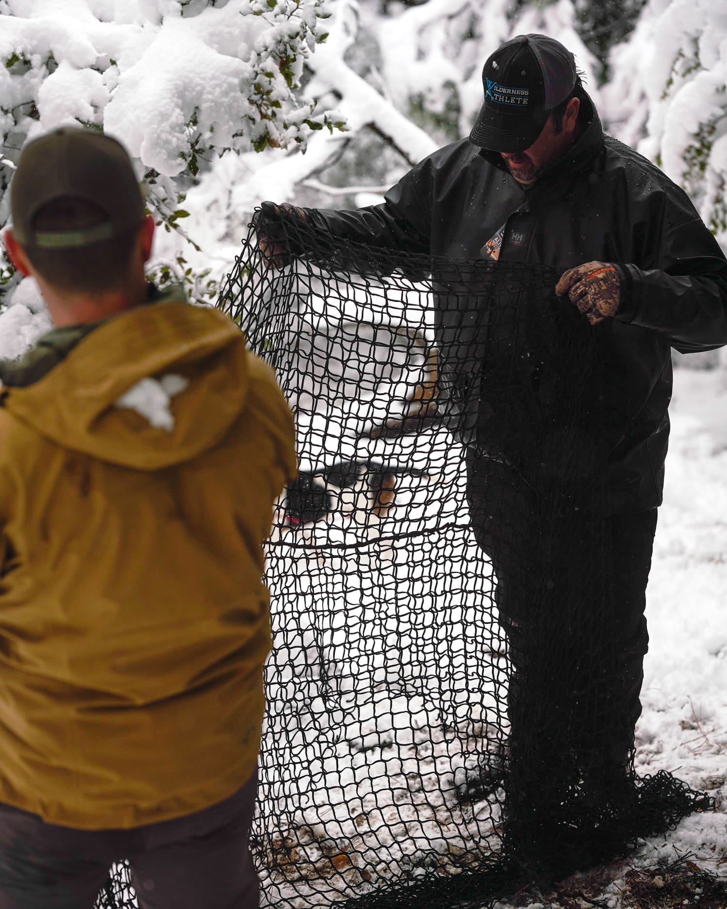 With a little more cowboy doctoring, we got her settled down and collared. We then built a barrier between her and the creek in case she awoke and took off running into it. The temperature was in the single digits, and the semi-frozen river might not have spat her back out if she did.