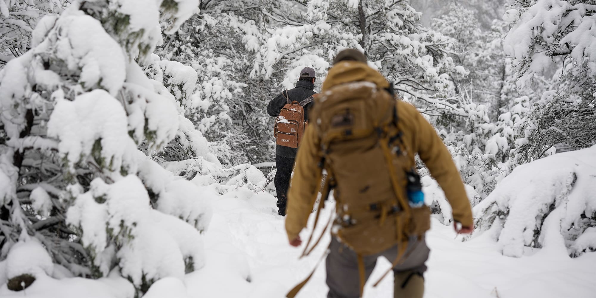 Floyd ended up catching a track up the mountain a few miles, so we fishtailed our way up a virgin snow-covered two-track through the pines and around bends with biblical sunrise vistas. His dogs were sent to find the target and get it bayed up. After about 45 minutes, all of the dog symbols on the Garmin were vertical, and the bay meter was off the charts.