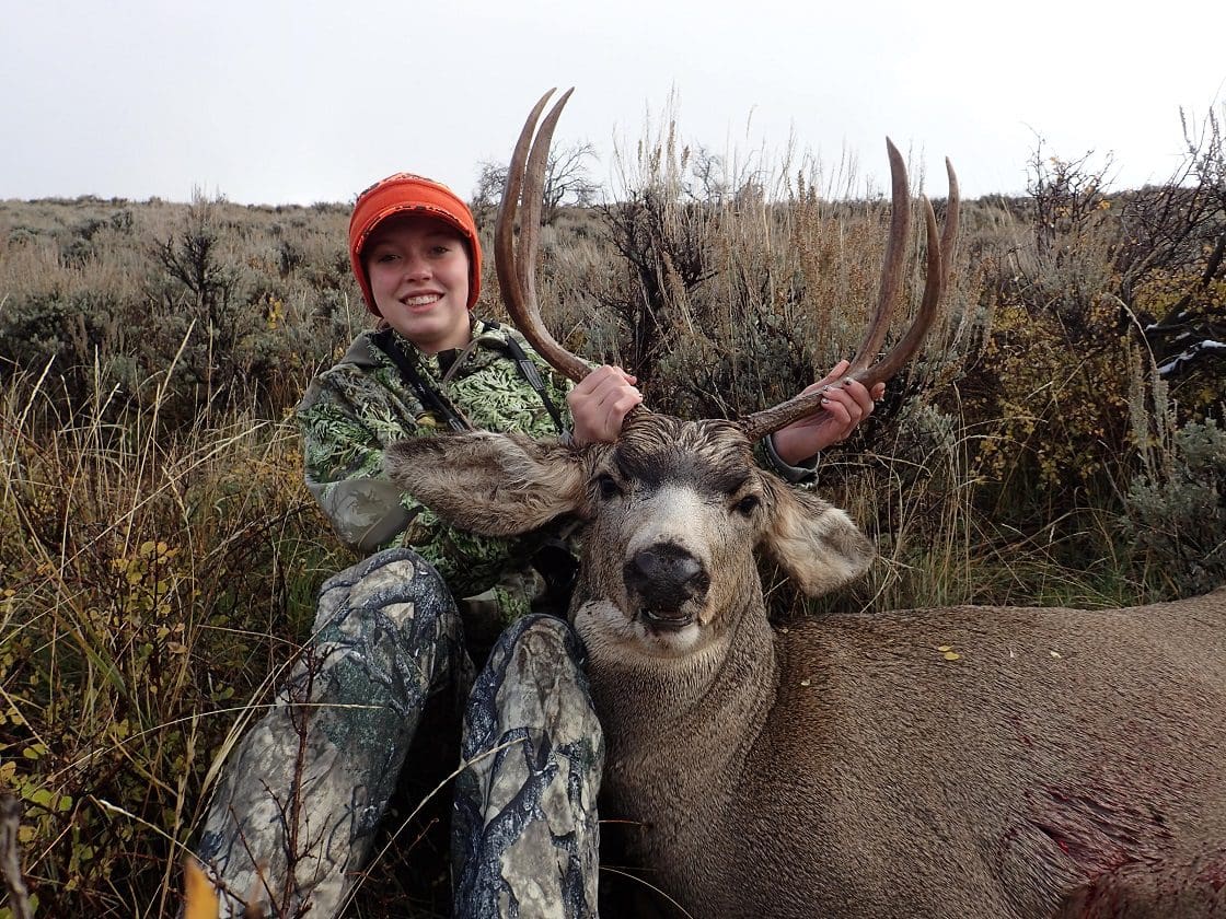 As I turned onto the main road to our next location, I told Paige we had 4 miles until we were back on public land. She held my Garmin as we navigated the now muddy road from the melting snow. “We'll be on the public land in about 400 yards”, came her soft reply as she was staring at the GPS in her hands. About then I spotted 10 deer feeding 200 yards off the road. 5 were bucks. 3 forkies and 2-3 points. We watched them for a couple minutes with no hope of them crossing over to public anytime soon. As I headed north again, I knew she was contemplating her choice of passing up some of those young bucks from our first spot. I was going to offer some words of encouragement when I could see a fence and cattle guard approaching. Paige verified that we were about to cross back onto our second location. As we dropped over a small rise toward the cattle guard, 8 deer raised their heads from the tall sage. Two were small 3 points! Half the deer were 10 feet on the legal side of the fence and the other half were on private. I started to ask Paige what she wanted to do when she spotted 2 more bucks up the road 200 yards. No questions needed to be asked about the better of those 2 bucks. I pulled past all the deer until the truck was hidden behind a small rise. Paige grabbed the Weaver rifle and I grabbed the shooting sticks. We crept over the rise to see the 2 bucks on a fast walk toward the private. Paige grabbed the sticks and settled the rifle. I told her to take him whenever she felt solid. I barely got the words out when the 300 barked and her buck kicked his hind feet and attempted to run. He only made it 40 yards before piling up in a sagebrush. As Paige and I stood there and hugged she grabbed the GPS out of her pocket. We both looked at the screen with gratitude knowing he died about 100 yards on our side of the fence.