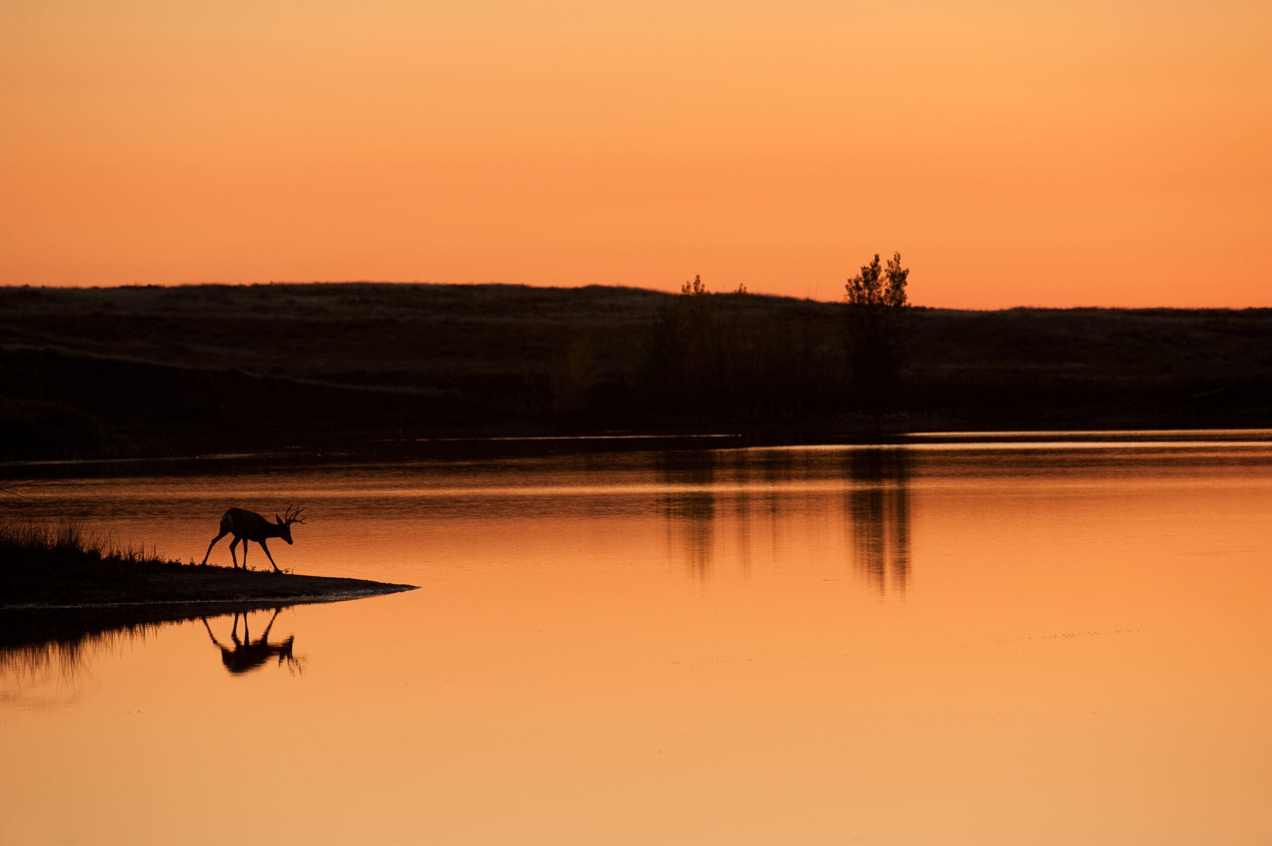Early morning mid-August sun rising over a prairie pothole lake in eastern Montana. I was up early in anticipation of capturing a lake/sunrise shot. While I was waiting, a small buck walked to the edge and drank from the lake. I composed the image using the rule of thirds, 1/3 sky for a background, 1/3 deer/lake/island for middle ground, and 1/3 lake reflection for the foreground.