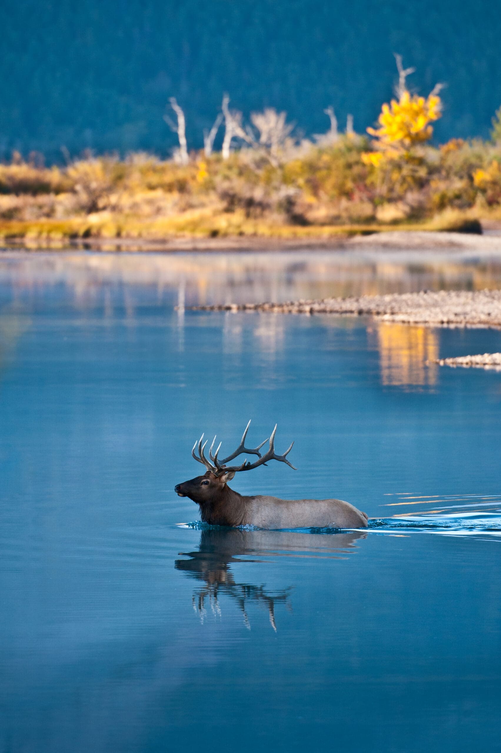 The advantage of having two cameras-one set up with a long prime, the other set up with my favorite all-purpose lens, the Nikon 224-120mm f4-is that I got this photo. I noticed the cow beginning to cross the river. After a few minutes, the bull appeared, bugling from out of the trees, and followed her across. I carried the second body attached to the 24-120mm lens, attached to the Cotton Carrier, another tool I never go into the field without. Notice the rule of thirds-1/3 background, 1/3 middle ground, 1/3 foreground.