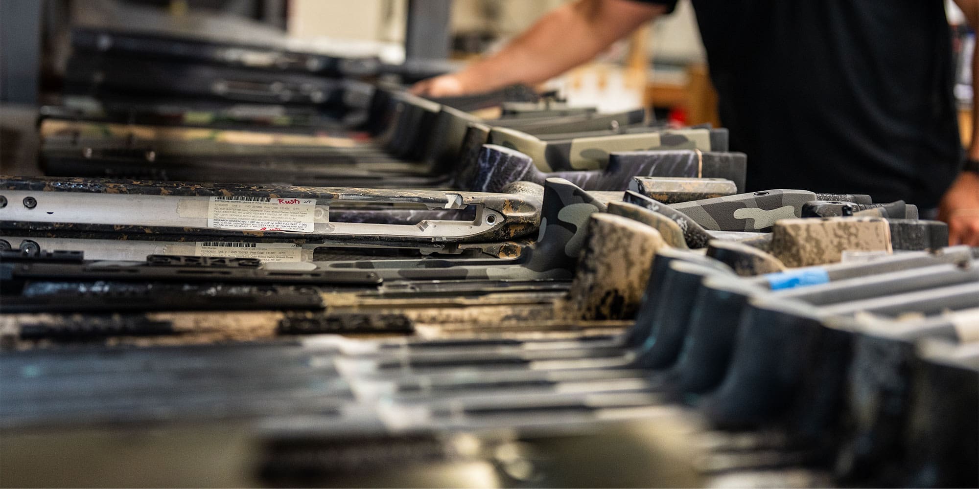 Inside the McMillan facility, the air carries the scent of work. It’s a blend of epoxies, glues, and chemical concoctions that somehow land on the pleasant side of industrial–equal parts laboratory and garage. The sounds are subtle, but constant: the swish of a brush laying finish, the rasp of sanding, the gentle spray of texture, and the occasional thump of a stock being staked into a mold. It’s not loud. It’s not sterile. It’s a workspace that breathes. Dust floats in the air, but only just enough to remind you that this is a place where things are made by hand, not by accident.