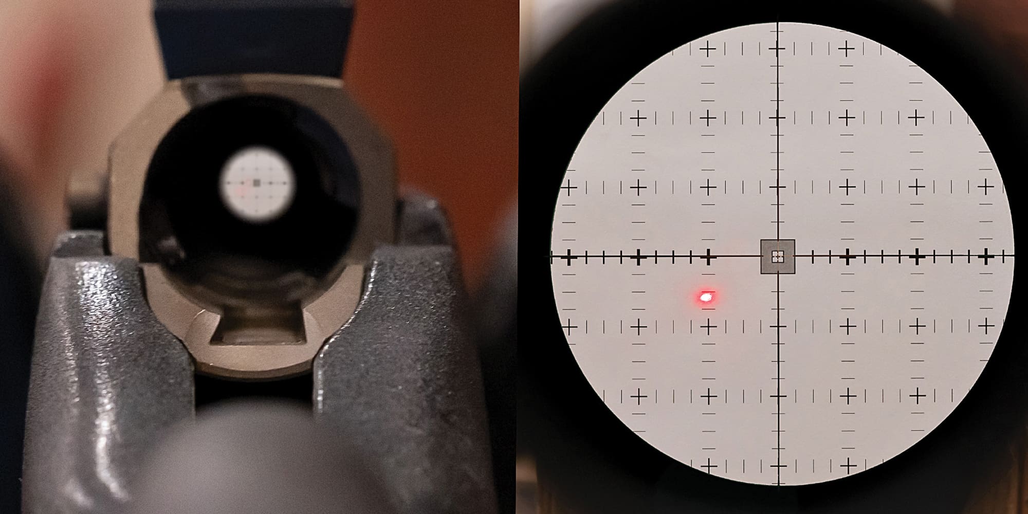 Next, you will want to attach the boresighter to your rifle and aim at your target. When using the standard kit, you will see a grid with your reticle overlaid when you look through your scope. Simply make the necessary adjustments to put your reticle in the center of the grid. The laser bore sighter will beam a dot onto your target. From here, adjust your turrets so the laser is centered in your reticle.