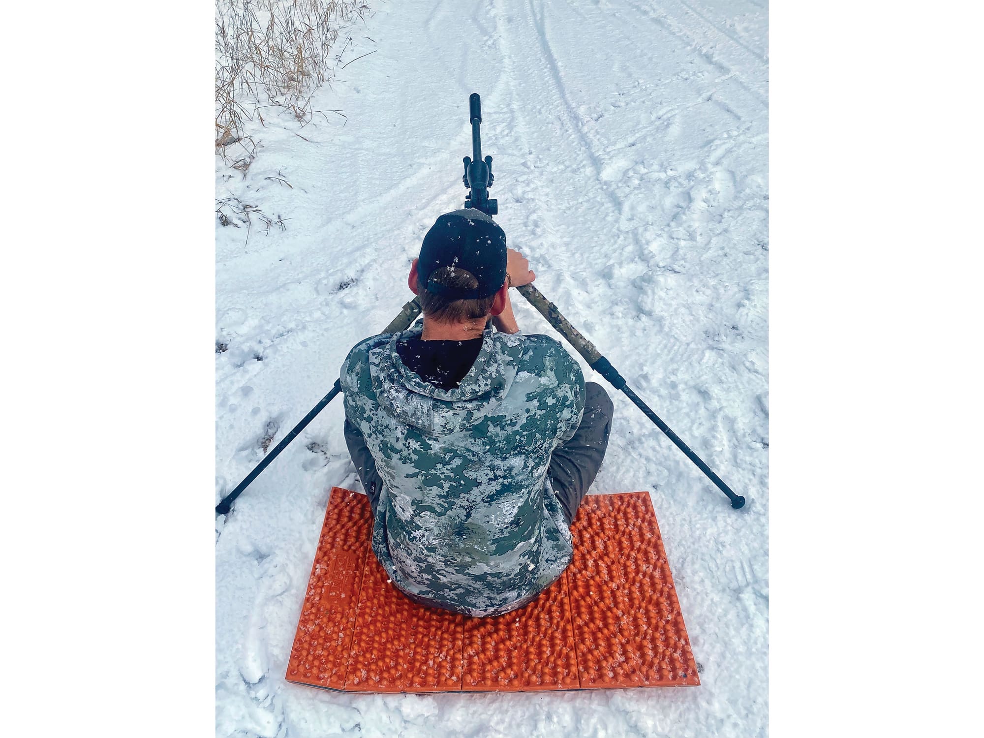 While seated shooting is the most stable, kneeling is sometimes required to shoot over rocks, tall grass, or brush. Following the same process of prepping the tripod and rifle to the proper height ensures the shooter is set for proper cheek weld and contact with the recoil pad. Most often, I add about 8-10” of extension in the middle leg from the sitting position to get the proper height for kneeling. Everyone is built differently, so find what works best for you. Build your position around having both knees together with your feet tucked flat and your butt resting atop your heels. If time permits, I use my Phoenix Shooting Pad under my knees to help keep sharp rocks or freezing snow and ice from destroying my kneecaps. Try to avoid flexing your feet under your butt with your boot tread still touching the ground. This will add a ton of muscle tension under your torso which will create shaking and fatigue. The key to kneeling and seated shooting off a tripod is reducing muscle tension and ensuring a natural point of aim behind the rifle.