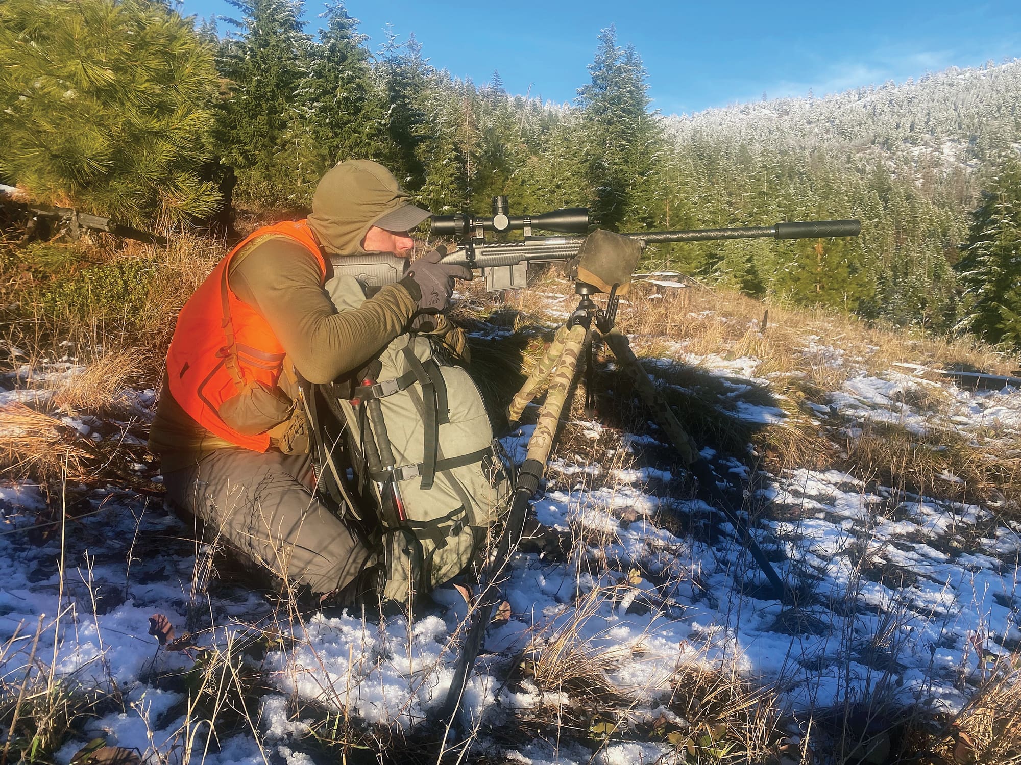 Once the legs are set for your usual seated glassing position and the rifle is clipped in, ensure the rifle is at the proper height for you to comfortably see through the optic and have a normal cheek weld with the rifle shouldered atop your pectoral muscle and across your collar bone, not out in the shoulder pocket. Shouldering the rifle closer to the centerline of your chest will allow much better recoil management as opposed to blading your body off sideways. If you need to make adjustments to height, do so now and work a system out so you can make adjustments quickly and smoothly without obtrusive movements and noise.