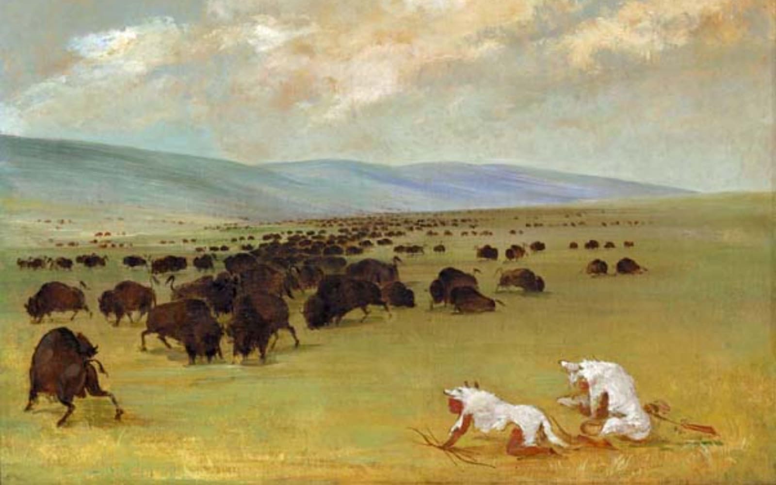 George Catlin spent his life in the early 1800s out West chronicling the Native Americans’ vanishing way of life through both writing and paintings. One such painting depicts Native Americans disguising themselves as wolves. The bison knew that the best way to avoid being killed by a human was to run. The exact opposite was true for wolves; wolves only attacked running bison, so by standing their ground, the buffalo had a higher chance of staying safe. The native hunters played to this by masking the human outline and disguising themselves as animals.