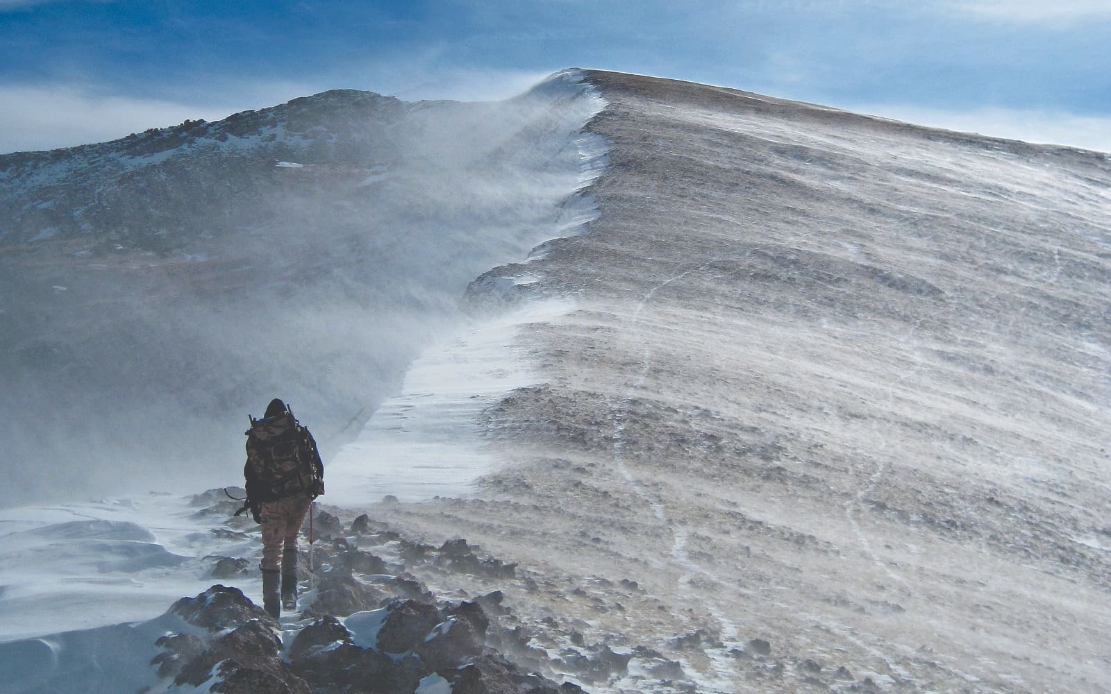 I had gotten myself into a predicament. I was alone at just over 13,000 feet on December 2, hurriedly skinning my bighorn ram that I had taken the afternoon before. The wind was blowing a steady 20-30 mph with higher gusts as clouds raced overhead with a foggy temperature inversion below. The edge of a winter storm front was just northwest of my location and I needed to get off the mountain before dark. Staying high was not an option for that night as I didn't want to succumb to hypothermia.